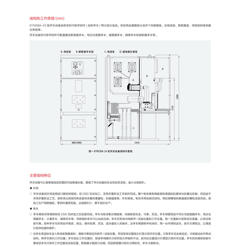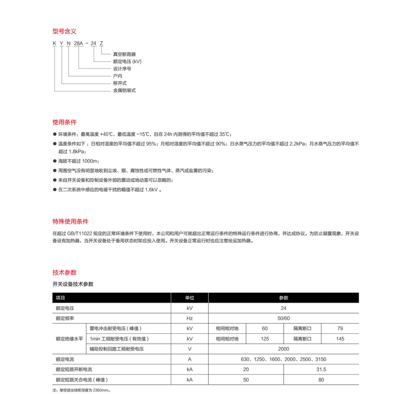 KYN28A-24铠裝移開式交流金屬封閉開關設備(以下簡稱開關設備),适用于戶内三相50/6OHz、額定電壓24kV的電力系統中,主要應用于發電廠,變電所、工礦企業及高層建築中,作爲接受和分配電能并對電路實行控制、保護和監測。
